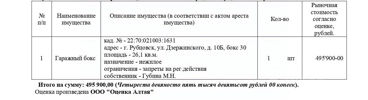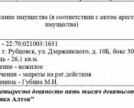 Гаражный бокс, кадастровый 22:70:021003:1631, площадь 26,1 кв.м., адрес: Алтайский край, г. Рубцовск, ул. Дзержинского, д. 10Б, бокс 30. Начальная цена 421 515 руб. (Губина М.Н., запрещения регистрации) (1936) (повторные)