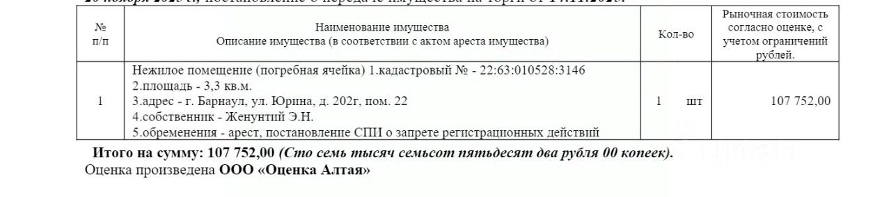 Нежилое помещение (погребная ячейка), подземный этаж, кадастровый 22:63:010528:3146, площадь 3,3 кв.м., адрес: Алтайский край, г. Барнаул, ул. Юрина, д. 202г, пом. 22. Начальная цена 91 589,20 руб. (Женунтий Э.Н., арест, запрещения регистрации) (2079) (повторные)