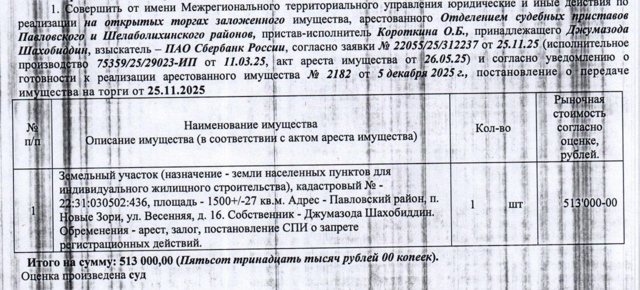 Лот15 Земельный участок, назначение земли населенных пунктов для индивидуального жилищного строительства, кадастровый 22:31:030502:436, площадь 1500+/-27 кв.м., адрес: Алтайский край, Павловский район, п. Новые Зори, ул. Весенняя, 16. Начальная цена 513 000 руб. 00 коп. (Джумазода Шахобиддин, ипотека, запреты на совершение регистрационных действий, арест) (2182).