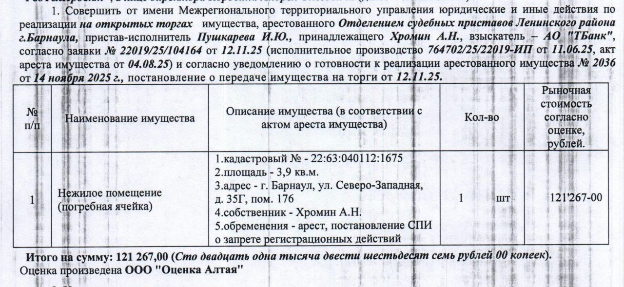 Лот1 Нежилое помещение (погребная ячейка), кадастровый 22:63:040112:1675, площадь 3,9 кв.м., этаж - подземный, адрес: Алтайский край, г. Барнаул, ул. Северо-Западная, д. 35Г, пом. 176. Начальная цена 103 076 руб. 95 коп. (Хромин А.Н., запреты на совершение регистрационных действий, арест) (2036) (повторные).