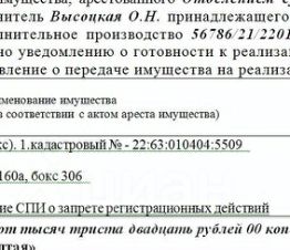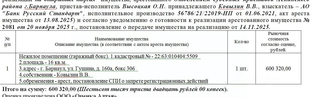 Лот10 Нежилое помещение (гаражный бокс). 1.кадастровый - 22:63:010404:5509 площадь - 16 кв.м., адрес - г. Барнаул, ул. Гущина, д. 160а, бокс 306. Нач.цена 510272 руб. (Ковылин В.В., арест, постановление СПИ о запрете регистрационных действий) (2081) (повторные)