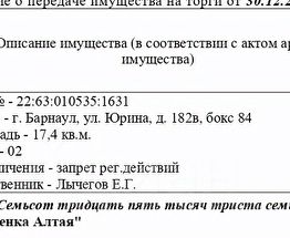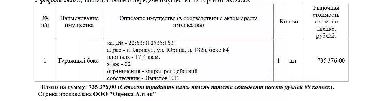 Гаражный бокс, этаж 02, кадастровый 22:63:010535:1631, площадь 17,4 кв.м., адрес: Алтайский край, г. Барнаул, ул. Юрина, д. 182в, бокс 84. Начальная цена 735 376 руб. (Лычегов Е.Г., запрещения регистрации) (97)
