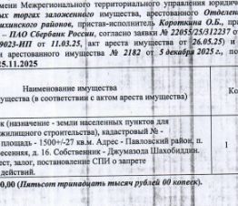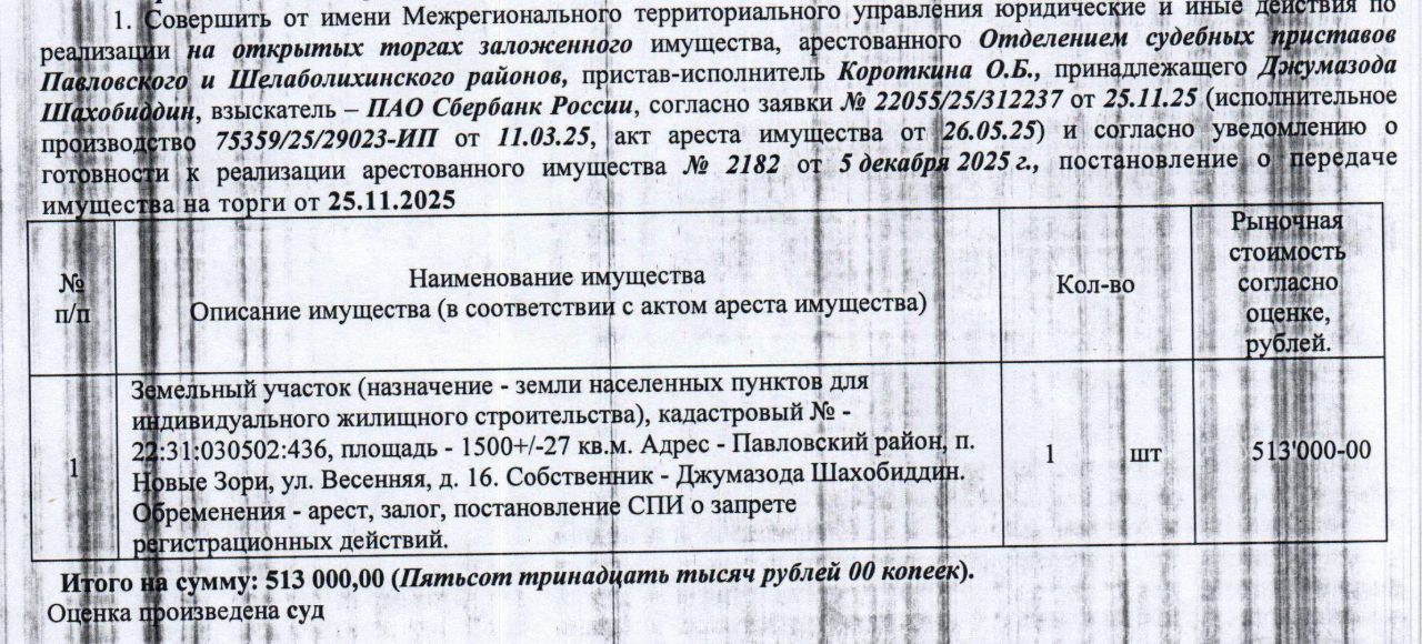 Лот2 Земельный участок, назначение земли населенных пунктов для индивидуального жилищного строительства, кадастровый 22:31:030502:436, площадь 1500+/-27 кв.м., адрес: Алтайский край, Павловский район, п. Новые Зори, ул. Весенняя, 16. Начальная цена 436 050 руб. 00 коп. (Джумазода Шахобиддин, ипотека, запреты на совершение регистрационных действий, арест) (2182) (повторные).
