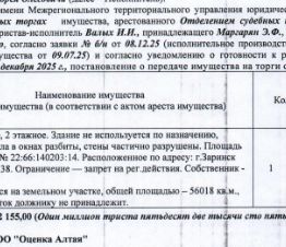 Лот4 Нежилое здание (без земельного участка), 1981 г.п., кадастровый 22:66:140203:14, площадь 650,7 кв.м., количество этажей 2, адрес: Алтайский край, г. Заринск, ул. Центральная, д. 38. Здание не используется по назначению, заброшено, стекла разбиты, стены частично разрушены. Здание находится на земельном участке общей площадью 56018 кв.м., земельный участок должнику не принадлежит. Начальная цена 1 149 331 руб. 75 коп. (Маргарян Э.Ф., запреты на совершение регистрационных действий) (2295) (повторные).