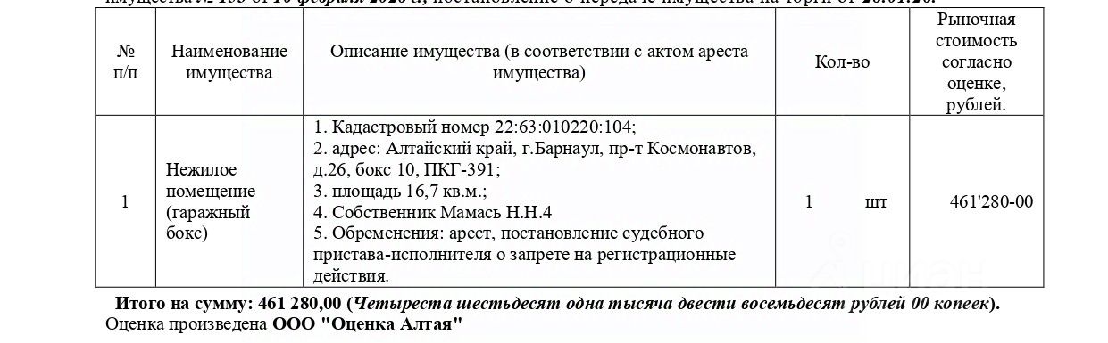 Нежилое помещение (гаражный бокс), кадастровый 22:63:010220:104, площадь 16,7 кв.м., адрес: Алтайский край, г. Барнаул, пр-т Космонавтов, д. 26, бокс 10, ПКГ-391. Начальная цена 461 280 руб. (Мамась Н.Н., арест, запрещения регистрации) (153)
