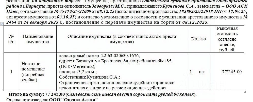 Лот2 Нежилое помещение (погребная ячейка) кадастровый номер: 22:63:020630:1676; адрес: г.Барнаул, ул.Брестская, 8а, погребная ячейка 85 (ПСК-Метелица); площадь 3,2 кв.м. Нач.цена 65658 руб. 25 коп. (Кузнецова С.А., арест, постановление судебного пристава-исполнителя о запрете на регистрационные действия) (2464) (повторные)