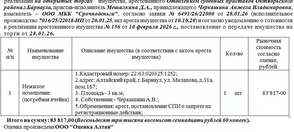 Лот5 Нежилое помещение (погребная ячейка) Кадастровый номер: 22:63:020325:1252; адрес: Алтайский край, г.Барнаул, ул. Малахова, д.31а, пом.167; Площадь - 3 кв.м; Нач.цена 83817 руб. (Собственник - Черкашина А.В.; 5.Обременения: арест, постановление СПИ о запрете на регистрационные действия) (156)