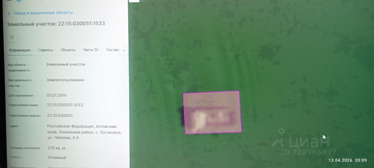 нежилое здание площадью 79,4 кв. м, с кадастровым номером 22:15:030701:630, по адресу: Российская Федерация, Алтайский край, р-н Зональный, с. Луговское, ул. Чапаева, д. 8а, расположенное на земельном участке площадью 270 кв. м, с кадастровым номером 22:15:030701:1533, по адресу: Российская Федерация, Алтайский край, Зональный район, с. Луговское, ул. Чапаева, д. 8А