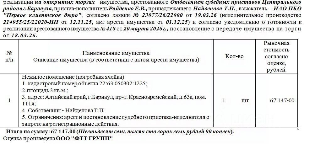 Лот1 Нежилое помещение (погребная ячейка) кадастровый номер объекта 22:63:050302:1225; площадь 3 кв.м. адрес: Алтайский край, г.Барнаул, пр-т. Красноармейский, д.63а, пом. 111я. Нач.цена 67147 руб. (Найденова Т.П. Ограничения: арест и постановление судебного пристава-исполнителя о запрете на регистрационные действия) (418)