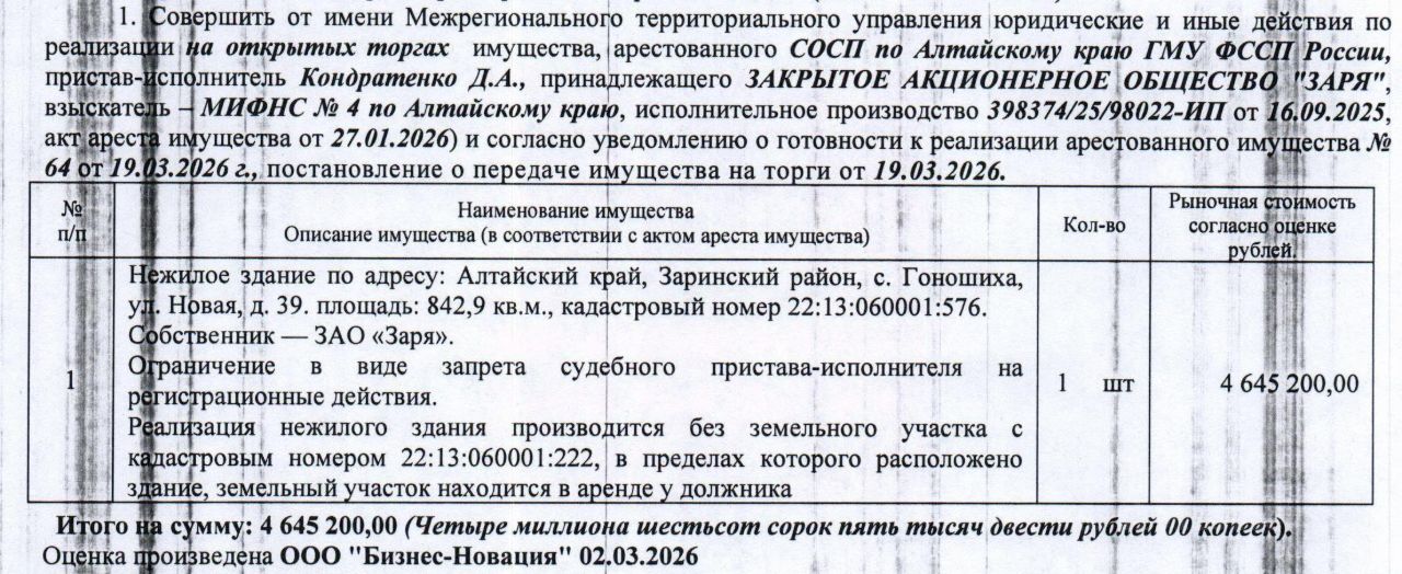 Лот10 Нежилое здание (без земельного участка), 2013 г.п., кадастровый 22:13:060001:576, площадь 842,9 кв.м., количество этажей 1, адрес: Алтайский край, Заринский район, с. Гоношиха, ул. Новая, д. 39. Здание находится на зем. участке с кад 22:13:060001:222. Здание продается без зем. участка, т.к. зем. участок находится в аренде у должника. Начальная цена 4 645 200 руб. 00 коп. (ЗАО "Заря", запреты на совершение регистрационных действий) (64/сосп).