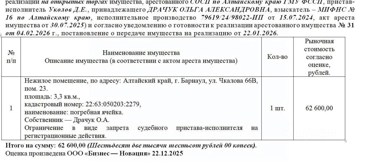 Лот2 Нежилое помещение, по адресу: Алтайский край, г. Барнаул, ул. Чкалова 66В, пом. 23. площадь: 3,3 кв.м., кадастровый номер: 22:63:050203:2279, наименование: погребная ячейка. Нач.цена 53210 руб. (Драчук О.А. Ограничение в виде запрета судебного пристава-исполнителя на регистрационные действия) (31) (повторные)