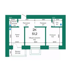 Продаётся 2-комнатная квартира в строящемся доме (Корпус 2), срок сдачи: III-кв. 2026, общей площадью 51.2 кв.м., на 1 этаже.