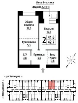Продаётся 2-комнатная квартира в строящемся доме (Корпус 1), срок сдачи: II-кв. 2027, общей площадью 42 кв.м., на 6 этаже. ЖК "Тургенев" на ул. Чеглецова, 25а представляет из себя два кирпичных здания высотой 9 этажей.