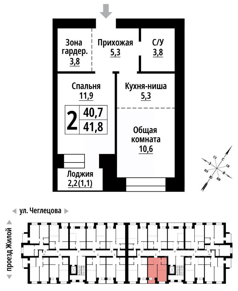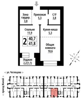 Продаётся 2-комнатная квартира в строящемся доме (Корпус 1), срок сдачи: II-кв. 2027, общей площадью 41 кв.м., на 2 этаже. ЖК "Тургенев" на ул. Чеглецова, 25а представляет из себя два кирпичных здания высотой 9 этажей.