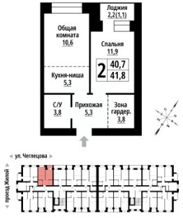 Продаётся 2-комнатная квартира в строящемся доме (Корпус 1), срок сдачи: II-кв. 2027, общей площадью 41 кв.м., на 2 этаже. ЖК "Тургенев" на ул. Чеглецова, 25а представляет из себя два кирпичных здания высотой 9 этажей.