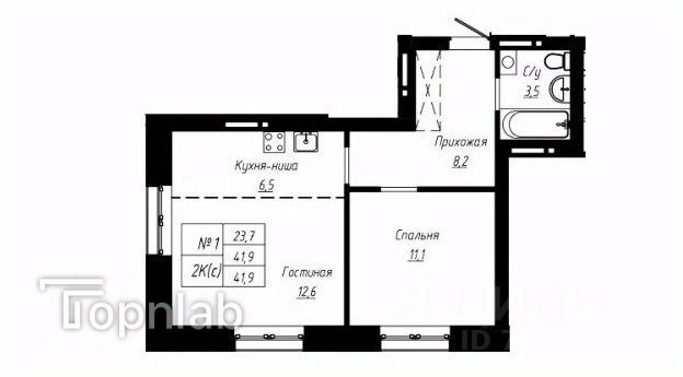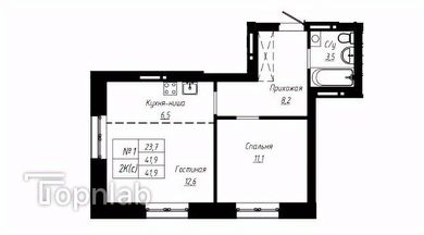 Общая площадь 42 м2 , Кухня-гостиная 19,4 12 , спальня 11,1 м2, большая гардеробная .