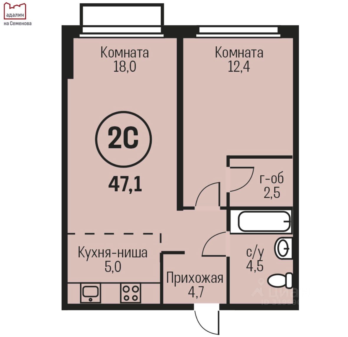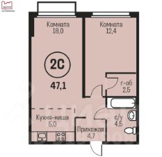 Общая площадь квартиры составляет 47,1 кв. м, из которых 30,4 кв. м — это жилая площадь, а кухня занимает 5 кв. м.