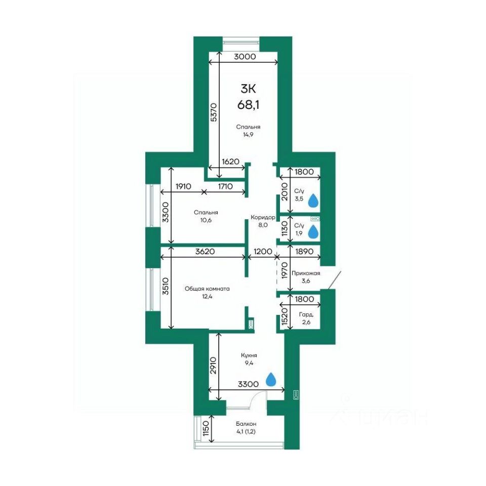 Продаётся 3-комнатная квартира в строящемся доме (Корпус 1), срок сдачи: IV-кв. 2025, общей площадью 68.1 кв.м., на 10 этаже.