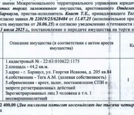 Данные в объявлении обновляются раз в сутки. Подробные параметры объекта, актуальные данные и НДС посмотрите на сайте электронных торгов.