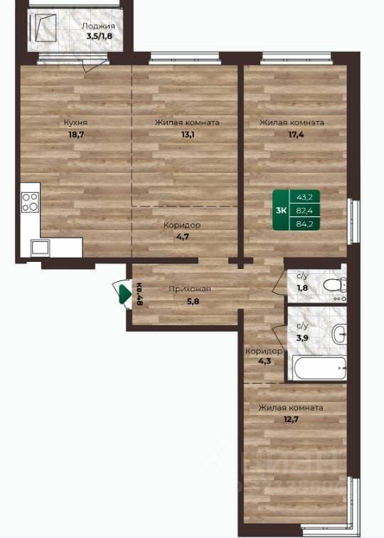 Наличие балкона добавляет дополнительное пространство для отдыха и возможность организовать небольшой зелёный уголок прямо у себя дома.