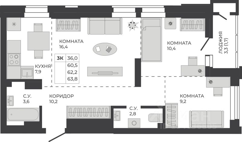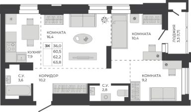Общая площадь62,2 м²