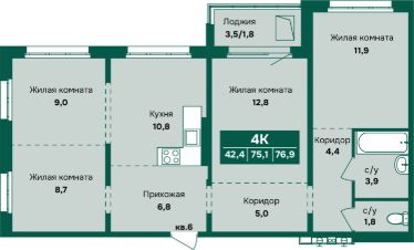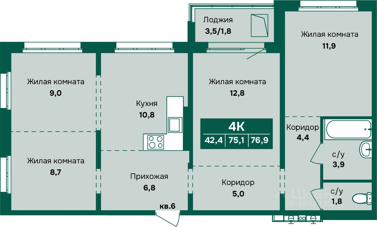 Продаётся 4-комнатная квартира в строящемся доме (Корпус 3), срок сдачи: II-кв. 2027, общей площадью 76.9 кв.м., на 12 этаже. Новый жилой комплекс "Камчатка" от группы компаний "Союз" расположен по адресу: г. Барнаул, по ул. Власихинская.