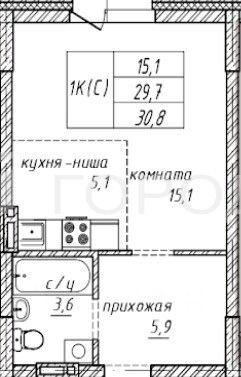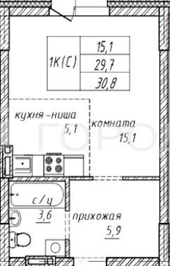 Квартира расположена на 9 этаже 16-этажного монолитно- каркасного дома с заполнением кирпича, который будет построен в 2026 году. Общая площадь квартиры составляет 30,8 кв. м, из которых 15,1 кв. м — жилая площадь, 5,1 кв. м — кухня. Высота потолков — 2,7 м. Окна выходят во двор. В квартире есть балкон, а также совмещённый санузел.