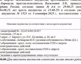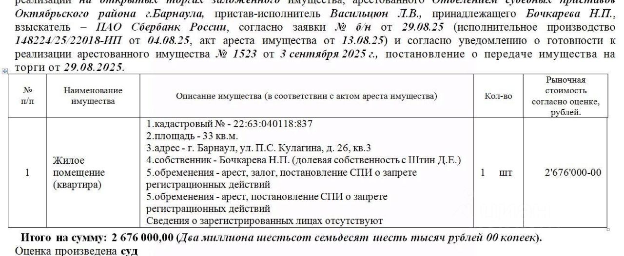 Лот4 Жилое помещение (квартира), кад. 22:63:040118:837, S-33 кв.м., адрес: АК, г. Барнаул, ул. П.С. Кулагина, д. 26, кв.3. Сведения о зарегист. лицах отсутствуют. Нач. цена 2676000 руб. (Бочкарева Н.П. (долевая собственность с Штин Д.Е., арест, залог, постановление СПИ о запрете р/д) (1523)