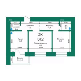 Продаётся 2-комнатная квартира в строящемся доме (Корпус 2), срок сдачи: III-кв. 2026, общей площадью 51.2 кв.м., на 10 этаже.