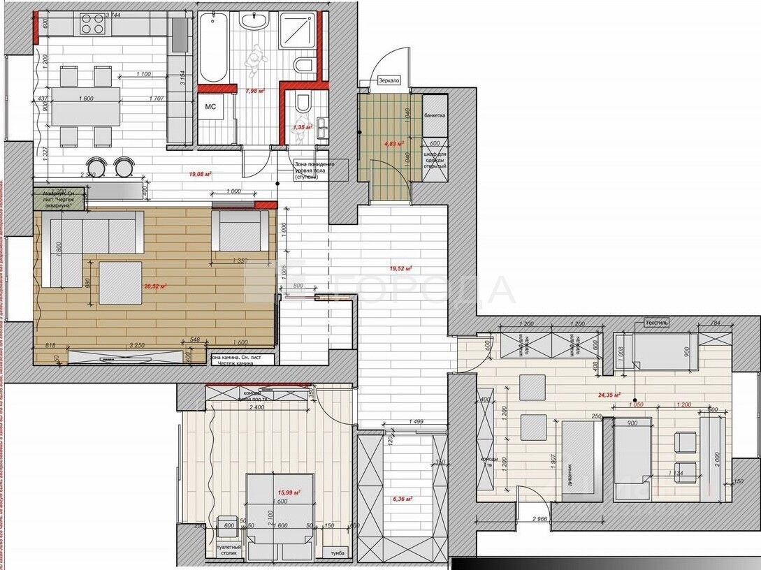Фасады кухни и мебель в гостиной облицованы натуральным шпоном, столешница из искусственного камня.