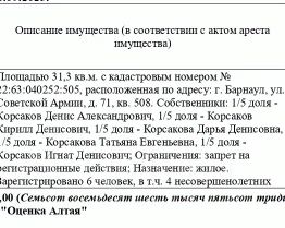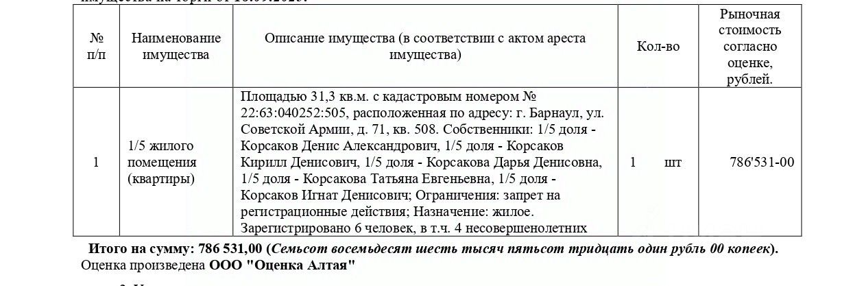 1/5 жилого помещения (квартиры), кадастровый 22:63:040252:505, площадь 31,3 кв.м., адрес: Алтайский край, г. Барнаул, ул. Советской Армии, д. 71, кв. 508. Зарегистрировано 6 человек, в т.ч. 4 несовершеннолетних. Начальная цена 786 531 руб. (Корсаков Д.А., Корсаков К.Д., Корсакова Д.Д., Корсакова Т.Е., Корсаков И.Д., запрещения регистрации) (1635)