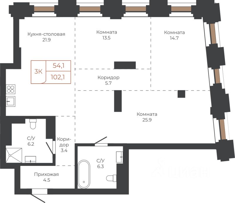 Продаётся 3-комнатная квартира в строящемся доме (Башня "Мира" (Корпус 2)), срок сдачи: I-кв. 2030, общей площадью 102.1 кв.м., на 7 этаже. Две башни формируют принципиально новое городское life-style пространство для жителеи и горожан. Единыи ансамбль площади Баварина и набережнои станет новым городским центром.