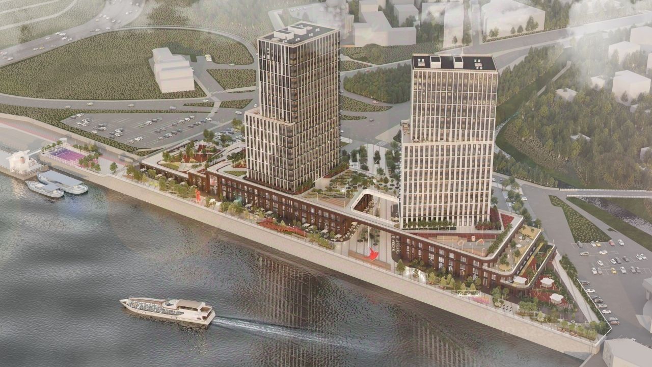 Башни "Столица" и "Мира" будут буквально парить в воздухе у набережной. Дома установят на стилобат - платформу до высоты третьего этажа. Решение даст возможность пересекать территорию насквозь через комплекс к реке.