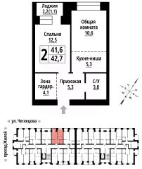 Продаётся 2-комнатная квартира в строящемся доме (Корпус 1), срок сдачи: II-кв. 2027, общей площадью 42 кв.м., на 6 этаже. ЖК "Тургенев" на ул. Чеглецова, 25а представляет из себя два кирпичных здания высотой 9 этажей.
