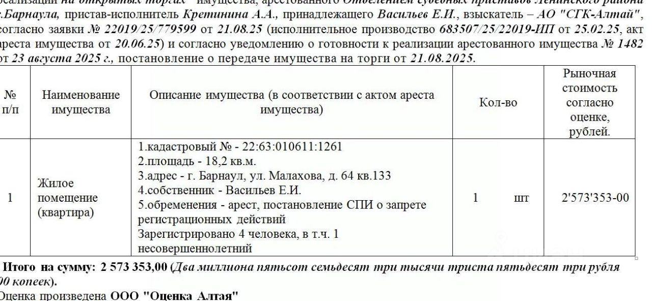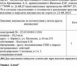 Лот3 Жилое помещение (квартира), кадастровый - 22:63:010611:1261 площадь - 18,2 кв.м. адрес - г. Барнаул, ул. Малахова, д. 64 кв.133. Зарегистрировано 4 человека, в т.ч. 1 несовершеннолетний. Нач.цена 2187350 руб. 05 коп. (Васильев Е.И., арест, постановление СПИ о запрете регистрационных действий) (1482) (повторные)