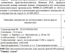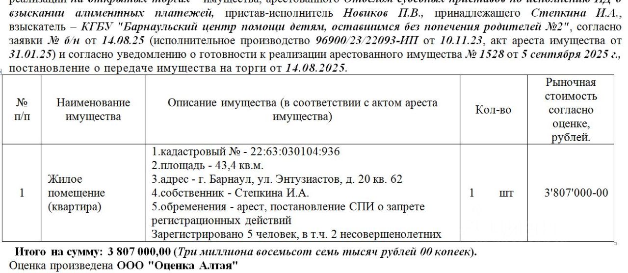 Лот2 Жилое помещение (квартира) кадастровый - 22:63:030104:936 площадь - 43,4 кв.м. адрес - г. Барнаул, ул. Энтузиастов, д. 20 кв. 62. Нач. цена 3235950 руб. (Степкина И.А., арест, постановление СПИ о запрете регистрационных действий) (1528) (повторные)