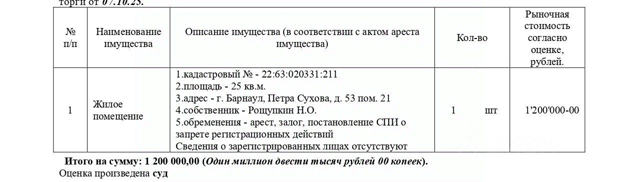 Жилое помещение, кадастровый 22:63:020331:211, площадь 25 кв.м., адрес: Алтайский край, г. Барнаул, Петра Сухова, д. 53, пом. 21. Начальная цена 1 200 000 руб. (Рощупкин Н.О., ипотека, арест, запрещения регистрации) (1832)