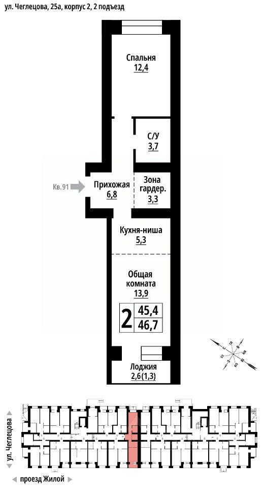 Продаётся 2-комнатная квартира в строящемся доме (Корпус 2), срок сдачи: II-кв. 2027, общей площадью 46 кв.м., на 1 этаже. ЖК "Тургенев" на ул. Чеглецова, 25а представляет из себя два кирпичных здания высотой 9 этажей.