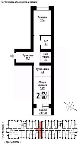 Продаётся 2-комнатная квартира в строящемся доме (Корпус 2), срок сдачи: II-кв. 2027, общей площадью 50 кв.м., на 4 этаже. ЖК "Тургенев" на ул. Чеглецова, 25а представляет из себя два кирпичных здания высотой 9 этажей.