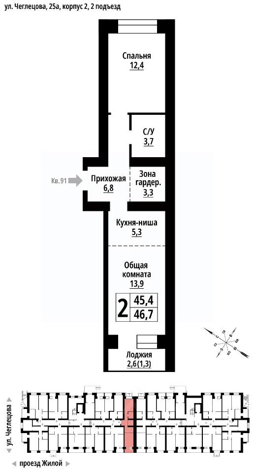 Продаётся 2-комнатная квартира в строящемся доме (Корпус 2), срок сдачи: II-кв. 2027, общей площадью 46 кв.м., на 6 этаже. ЖК "Тургенев" на ул. Чеглецова, 25а представляет из себя два кирпичных здания высотой 9 этажей.