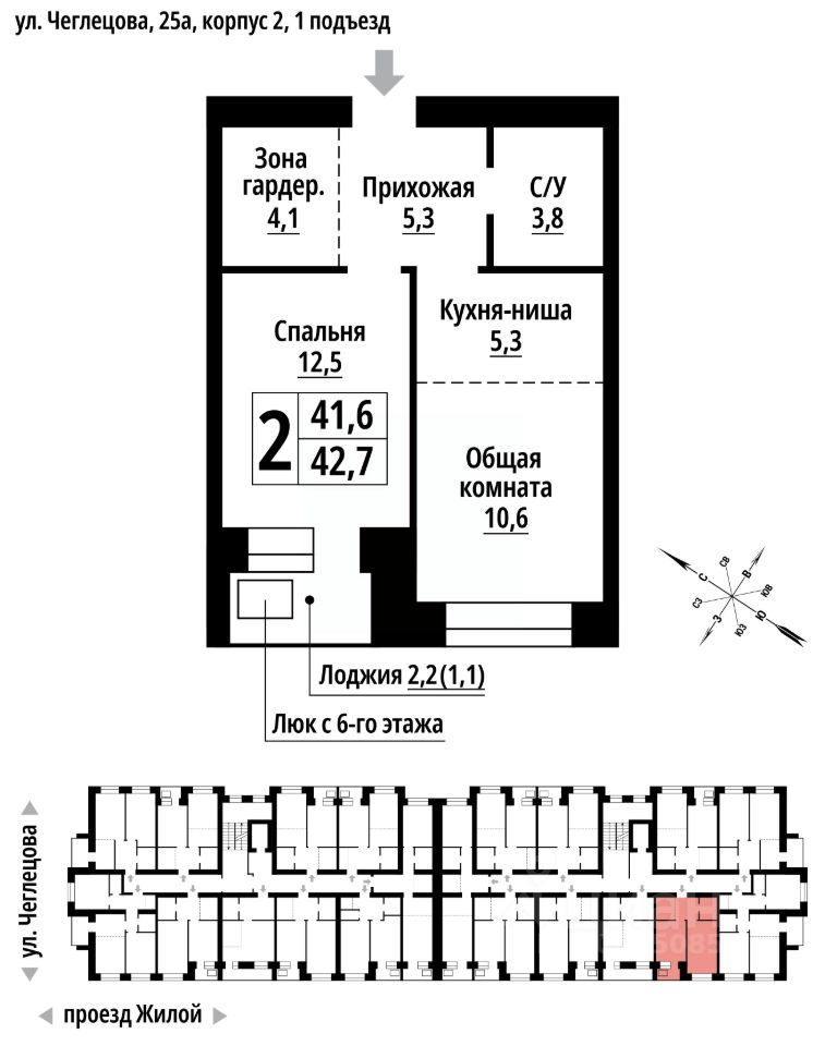 Продаётся 2-комнатная квартира в строящемся доме (Корпус 2), срок сдачи: II-кв. 2027, общей площадью 42 кв.м., на 5 этаже. ЖК "Тургенев" на ул. Чеглецова, 25а представляет из себя два кирпичных здания высотой 9 этажей.