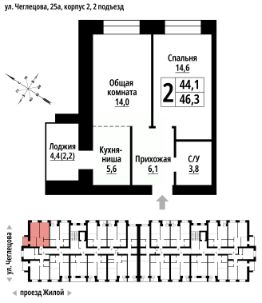 Продаётся 2-комнатная квартира в строящемся доме (Корпус 2), срок сдачи: II-кв. 2027, общей площадью 46 кв.м., на 6 этаже. ЖК "Тургенев" на ул. Чеглецова, 25а представляет из себя два кирпичных здания высотой 9 этажей.