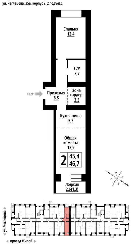 Продаётся 2-комнатная квартира в строящемся доме (Корпус 2), срок сдачи: II-кв. 2027, общей площадью 46 кв.м., на 1 этаже. ЖК "Тургенев" на ул. Чеглецова, 25а представляет из себя два кирпичных здания высотой 9 этажей.