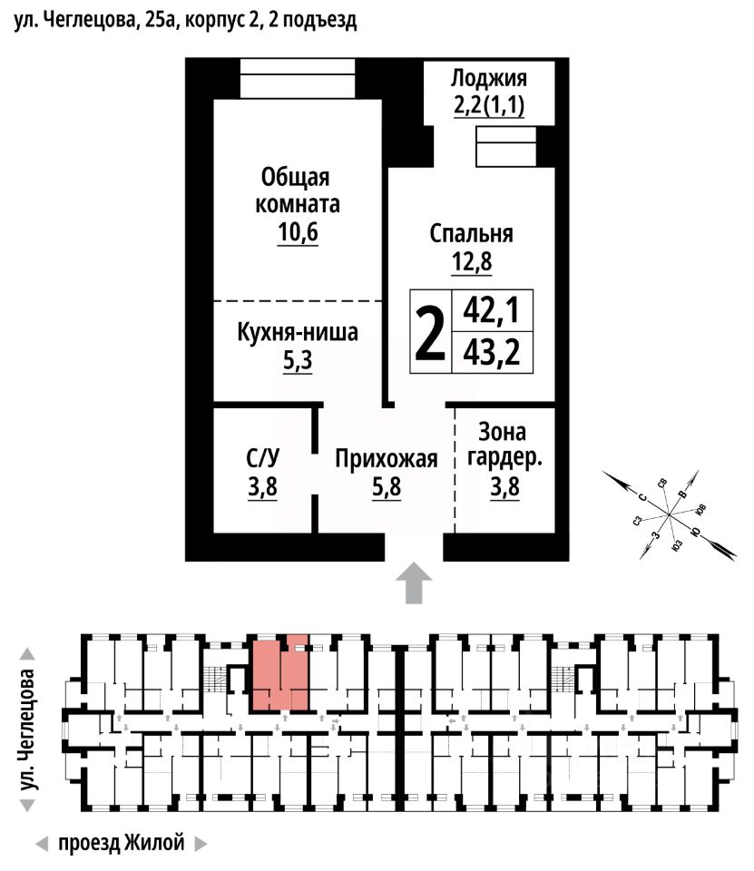 Продаётся 2-комнатная квартира в строящемся доме (Корпус 2), срок сдачи: II-кв. 2027, общей площадью 43 кв.м., на 2 этаже. ЖК "Тургенев" на ул. Чеглецова, 25а представляет из себя два кирпичных здания высотой 9 этажей.