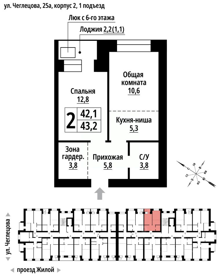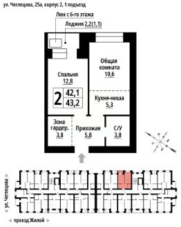 Продаётся 2-комнатная квартира в строящемся доме (Корпус 2), срок сдачи: II-кв. 2027, общей площадью 43 кв.м., на 7 этаже. ЖК "Тургенев" на ул. Чеглецова, 25а представляет из себя два кирпичных здания высотой 9 этажей.