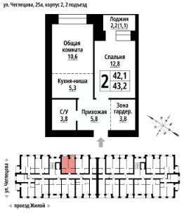 Продаётся 2-комнатная квартира в строящемся доме (Корпус 2), срок сдачи: II-кв. 2027, общей площадью 43 кв.м., на 2 этаже. ЖК "Тургенев" на ул. Чеглецова, 25а представляет из себя два кирпичных здания высотой 9 этажей.