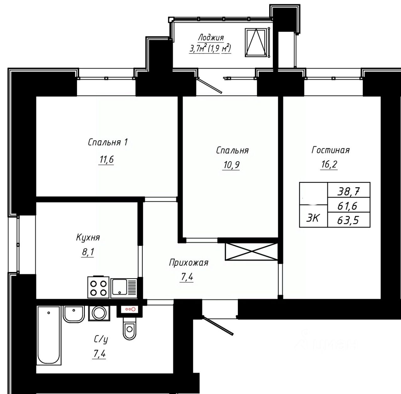 63,5 м²