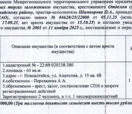 Лот6 Жилое помещение (квартира), кадастровый 22:69:020338:380, площадь 60 кв.м., этаж 8, адрес: Алтайский край, г. Новоалтайск, ул. Анатолия, д. 15, кв. 68. Зарегистрированных лиц 2 чел., из них несовершеннолетних 1 чел. Информация о задолженности по взносам на капитальный ремонт СПИ не предоставлена. Начальная цена 3 976 000 руб. 00 коп. (Перевалова А.А., ипотека, запрет на совершение регистрационных действий, арест) (2001).