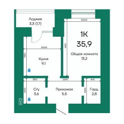 Продаётся 1-комнатная квартира в строящемся доме (Корпус 2), срок сдачи: III-кв. 2026, общей площадью 35.9 кв.м., на 8 этаже.