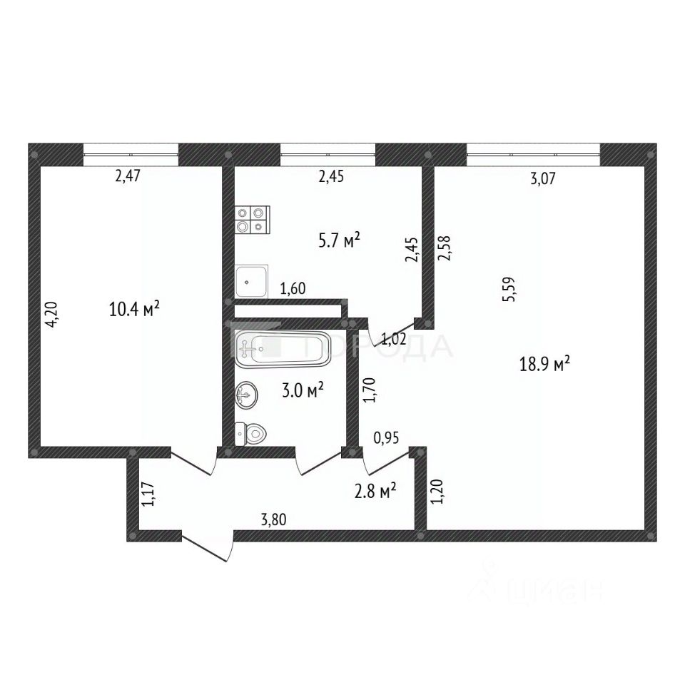 Просторная и солнечная квартира общей площадью 42 кв. м, включая жилую площадь 32 кв. м и кухню площадью 7 кв. м,
